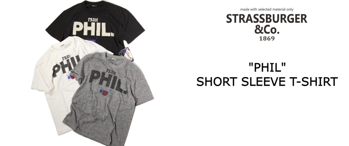 STRASSBURGER&Co.の展開するニュープロダクト"Gravitee"シリーズより"PHIL"のリリース。 ムラ糸を使用し、旧式の釣り編み機で生産したオリジナル天竺。 「OFF」「BLACK」の2カラー展開。 かつてアパレルの中心地であり、ジャズの都でもある東海岸の「フィラデルフィア」をモチーフとしたデザイン。 「OFF」は染み込み「BLACK」はラバーにてプリントされています。 ボディは丸胴、袖と裾はシングルステッチで仕上げられ、襟はバインダーネックで二本針による縫製でヴィンテージ同様に細すぎず太すぎないネック巾などヴィンテージ感満載のディテール。 生地は旧式の編み機である吊り編み機にて編んだ流通量の限られた生地を使用。 生産性が低い希少な生地で、洗濯しても型崩れしにくく長く着用できます。 ※メーカーWASH品