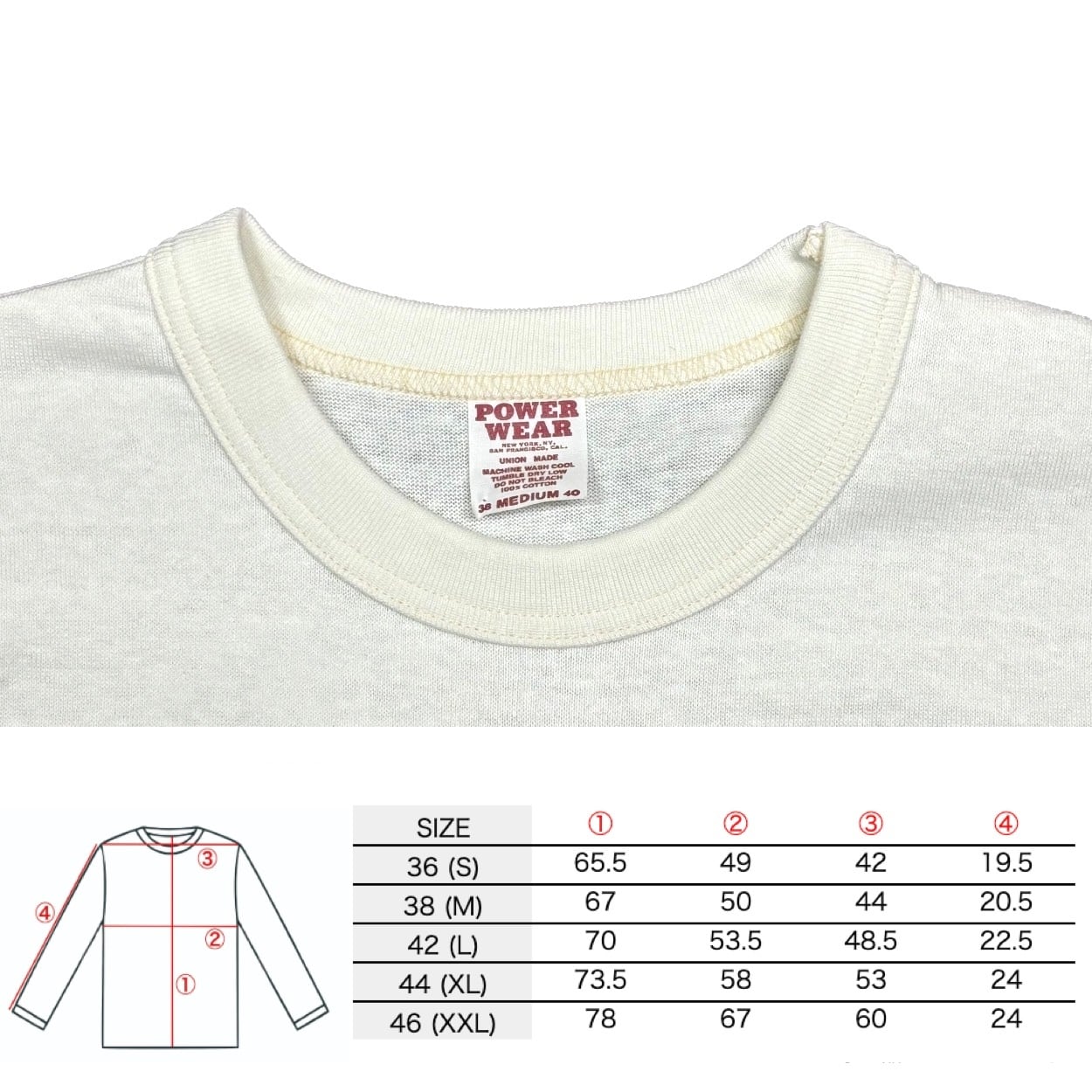 パワーウェアのタフな作りは健在で、生地はコットン100%のヴィンテージ・ミディアム・ウェイトに伸びにくいバインダーネック。