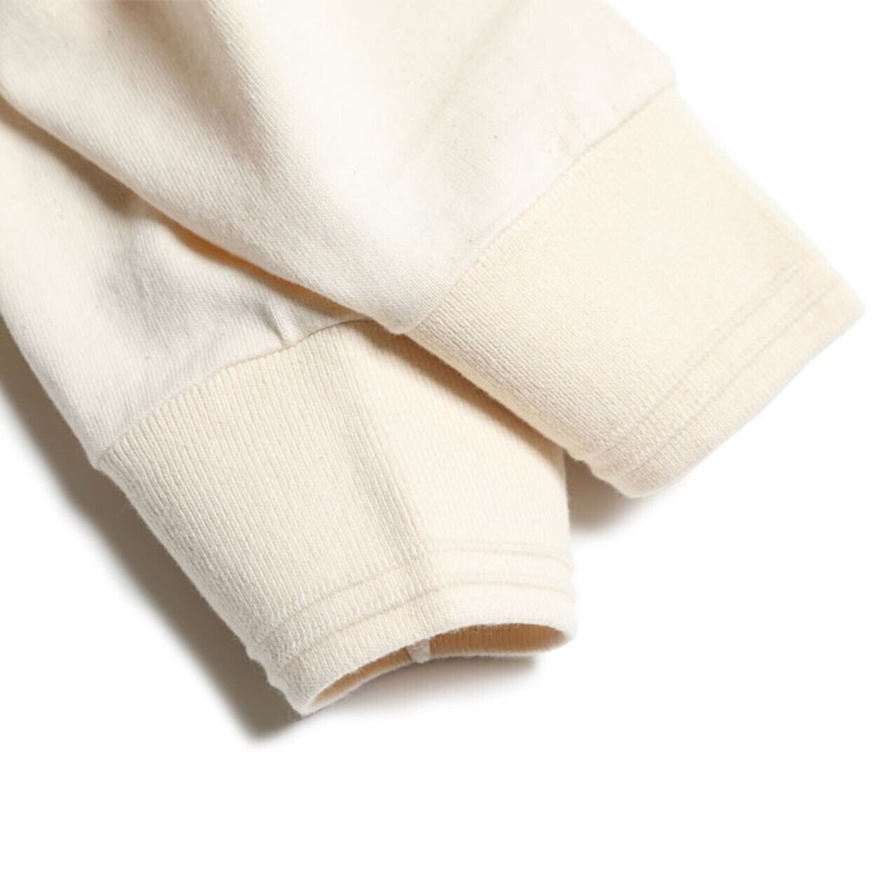 衿は耐久性のあるバインダーネック仕様、袖口は畦編みのデザインリブ。