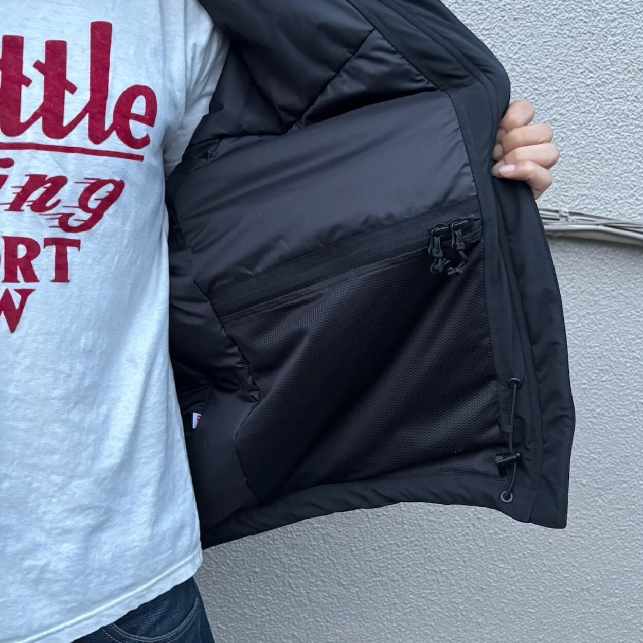 屋内では脇下のベンチレーションで体温調節も可能で、フロントポケット、両腕のジップ式パッチポケットに加え、メッシュの内ポケットも搭載され、機能性の高さは言うまでもありません。