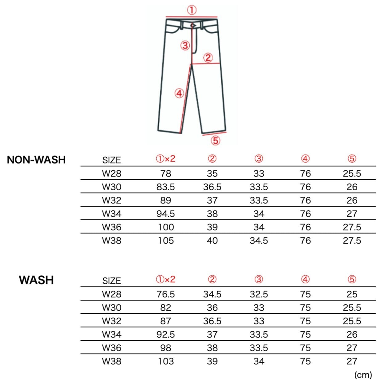 普段と同じサイズを選ぶとWASH後でもやや大きめのサイズ感になりますので、お持ちのパンツとサイズ表を比較の上、サイズ選びされることをオススメします。