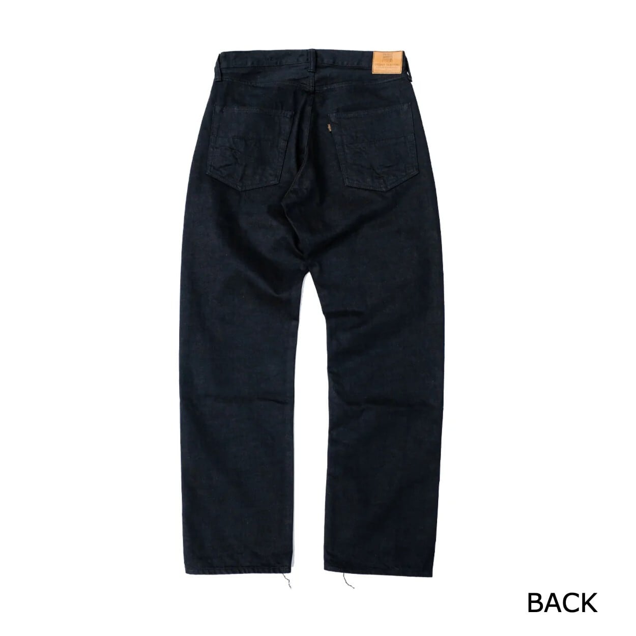 隠しリベット付きバックポケット、生成りスレキ、1605鉄ボタン、刻印入りカッパーUFOリベット、ディアスキン革パッチを採用。