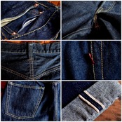 股上は少し深めで全体のシルエットはゆったりしており同シリーズの「1943」や「1951」に比べ、テーパーがそれほどない感じです。生地はオリジナルの14oz インディゴ デニムです。タテ糸とヨコ糸にインディゴがしっかり染まっていて、穿きこんで行くうちにタテ落ちやヒゲ落ちが綺麗に落ちていきます。
