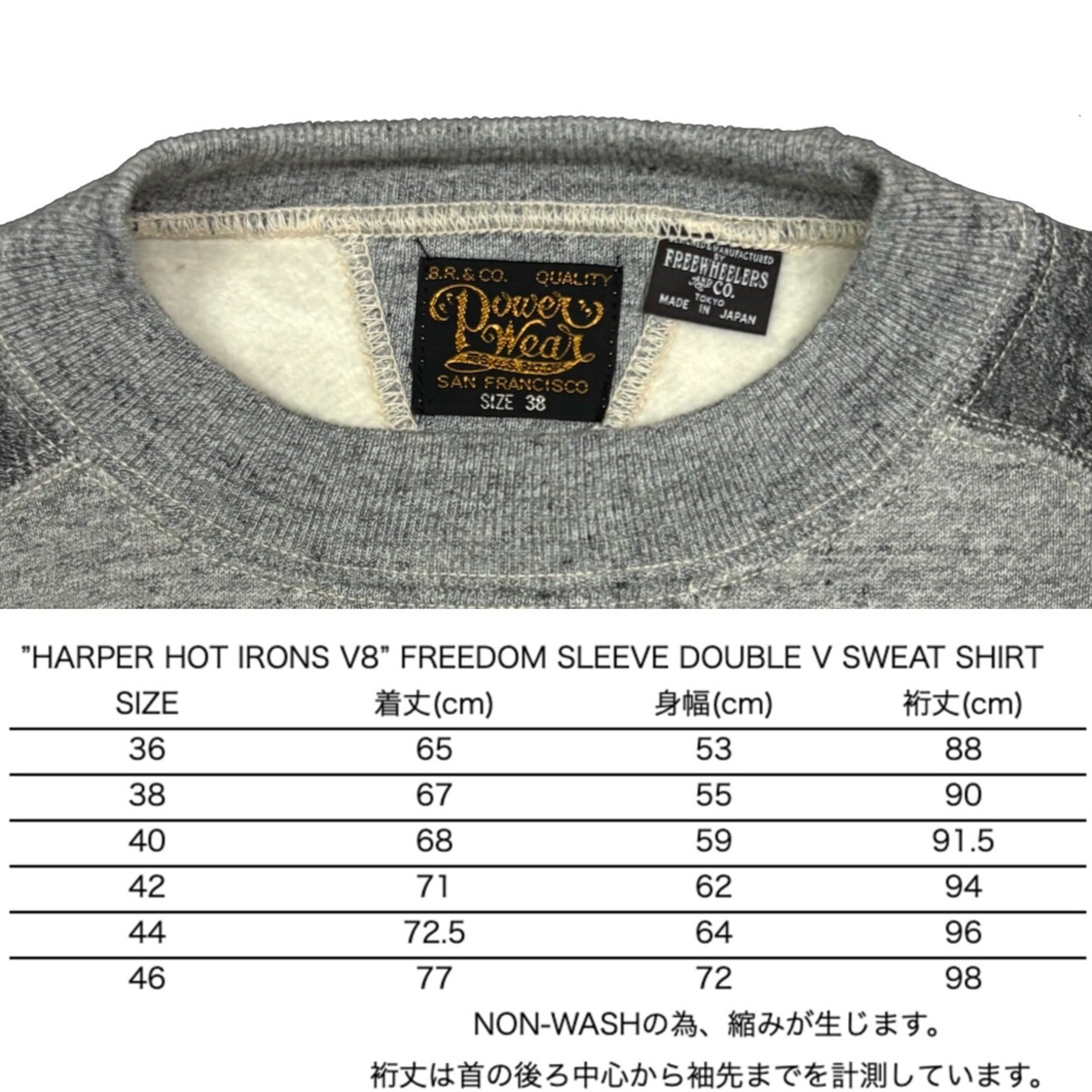 FREEWHEELERSが展開する「POWER WEAR」レーベルより、1930s ~ 1940s STYLEの”HARPER HOT IRONS V8” FREEDOM SLEEVE DOUBLE V SWEAT SHIRT スペシャル・ヘビーウエイトのリリース。