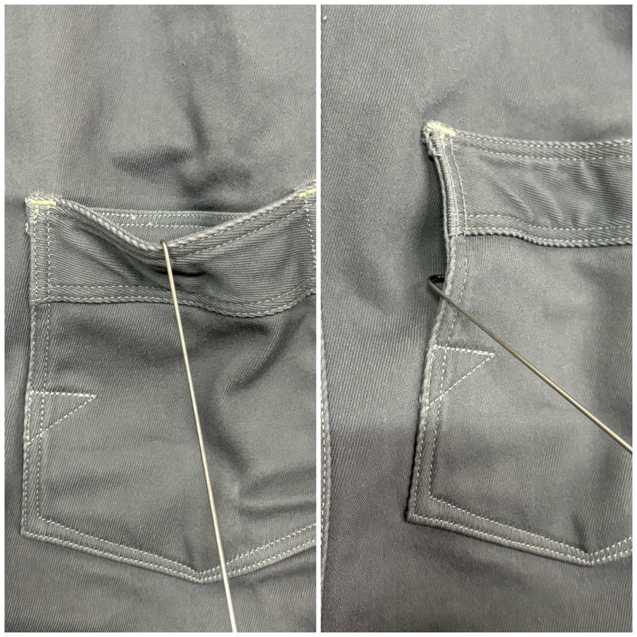 ポケットには左右非対称で二重構造のウォッチポケットとフラップ付きポケット、チンスト、ユニオンチケットなどの古いディティールが備わります。