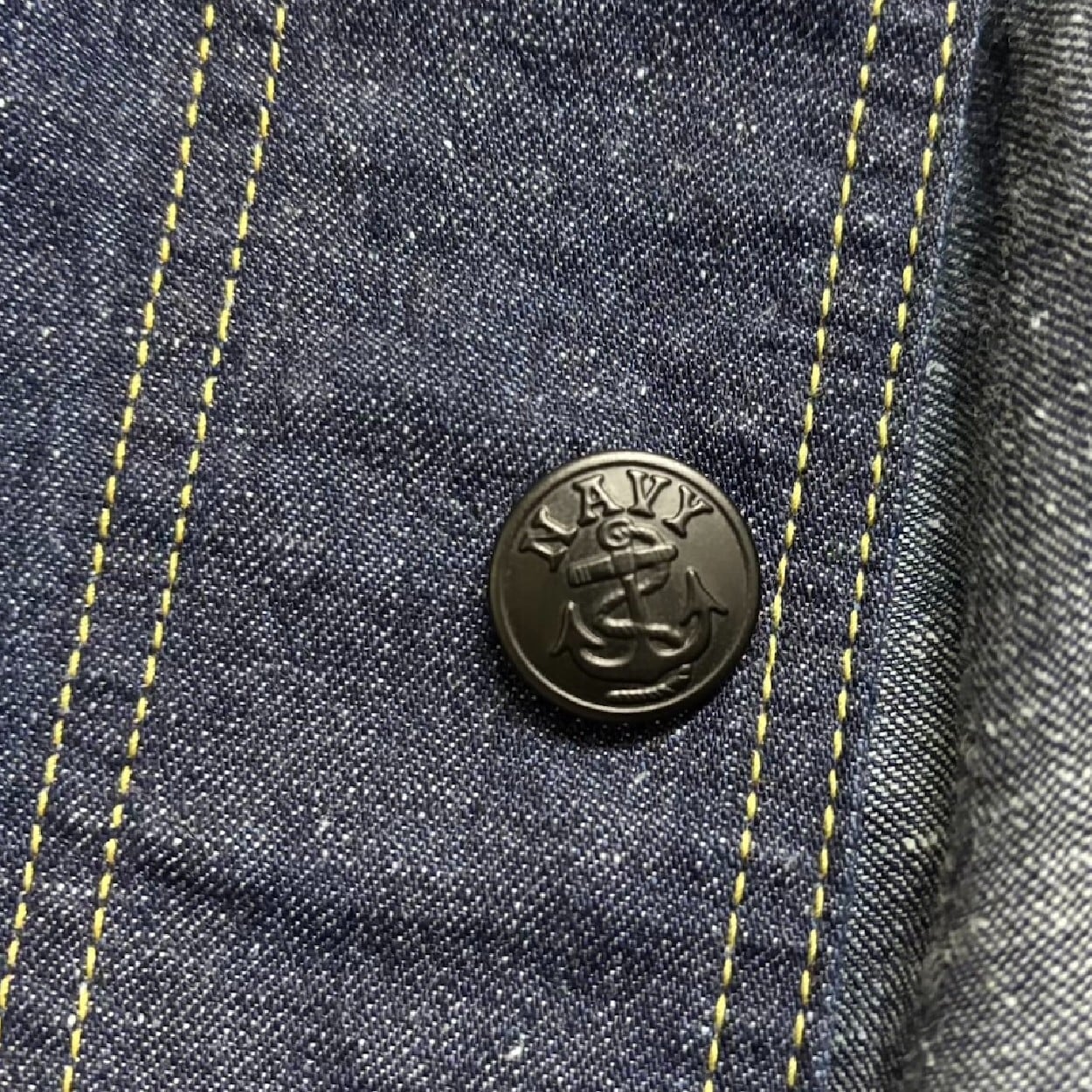 当時の仕様を踏襲し、ボタンホールにはヴィンテージ特有の菊穴を再現。フロントにはUS NAVYの象徴であるイカリマークを刻印したチェンジボタンを採用し、ディテールからも本格的な雰囲気を味わえます。