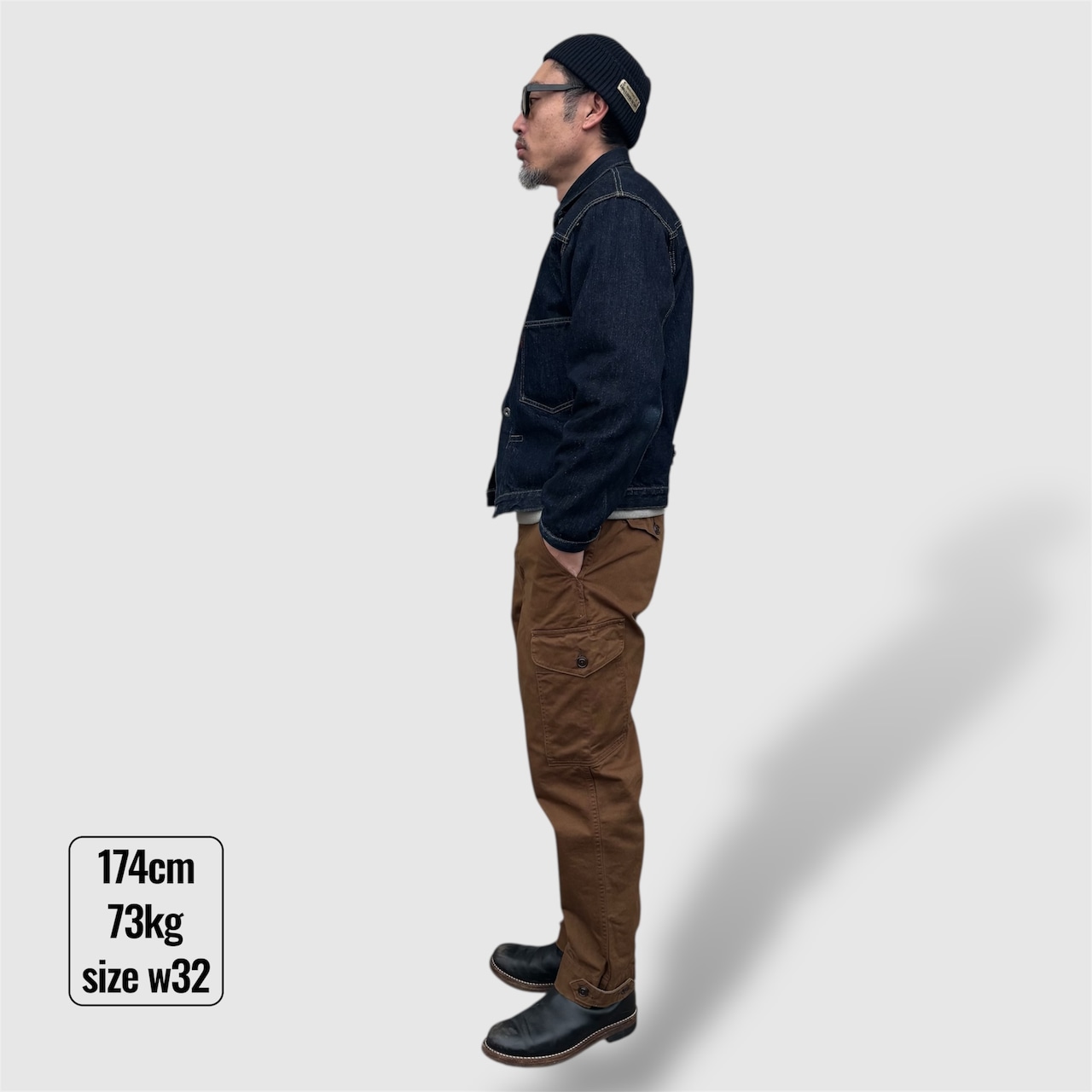 シルエットはヒップに少しゆとりがあり、裾にかけてテーパードの効いた全体的にスッキリした印象で、無骨でありながらキレイめにも着れて着回しの効く一枚です。