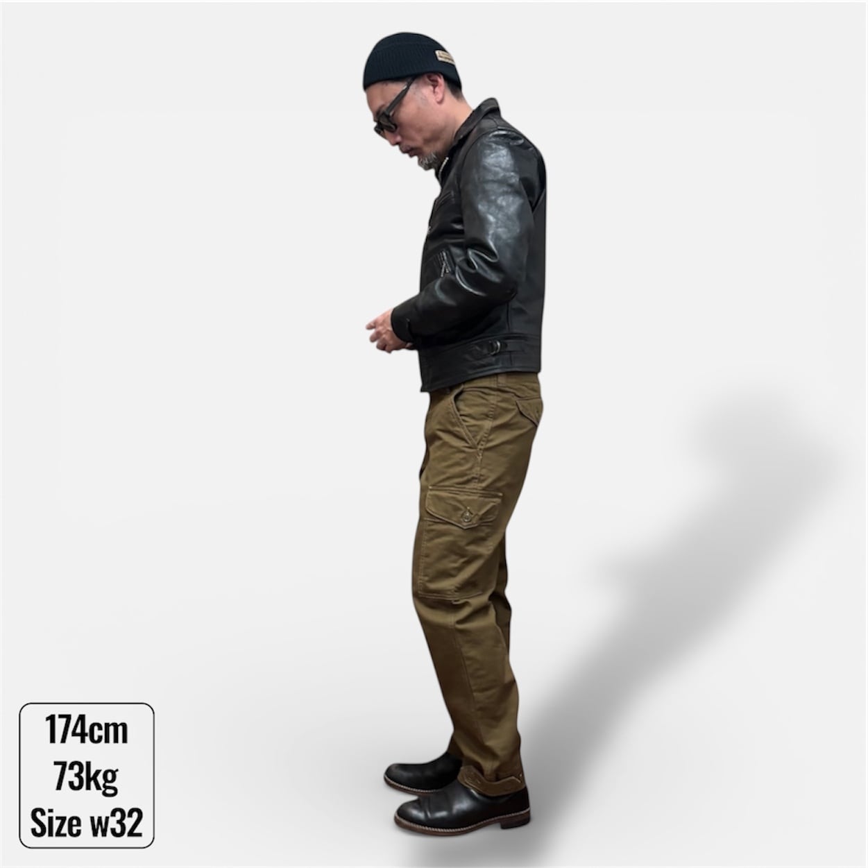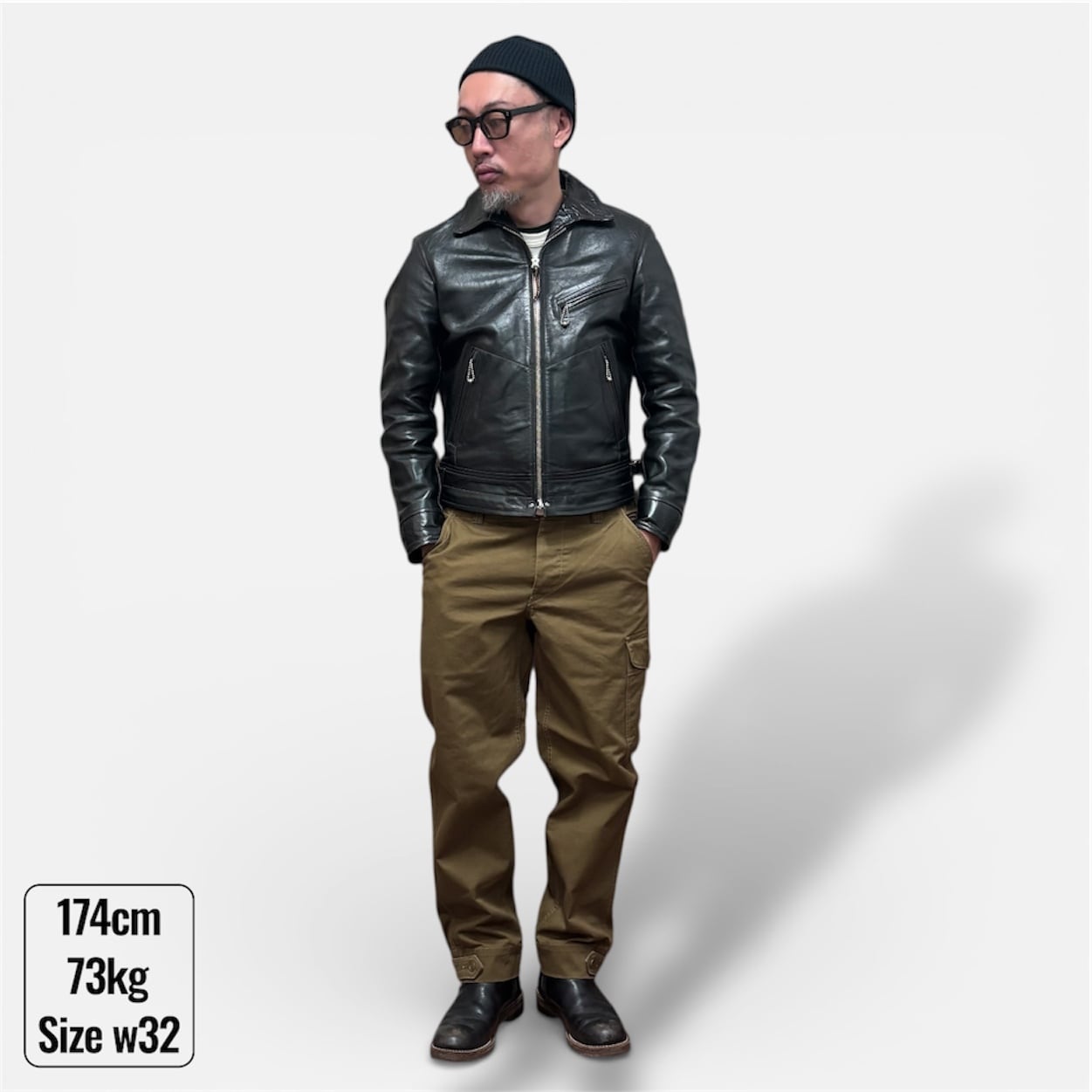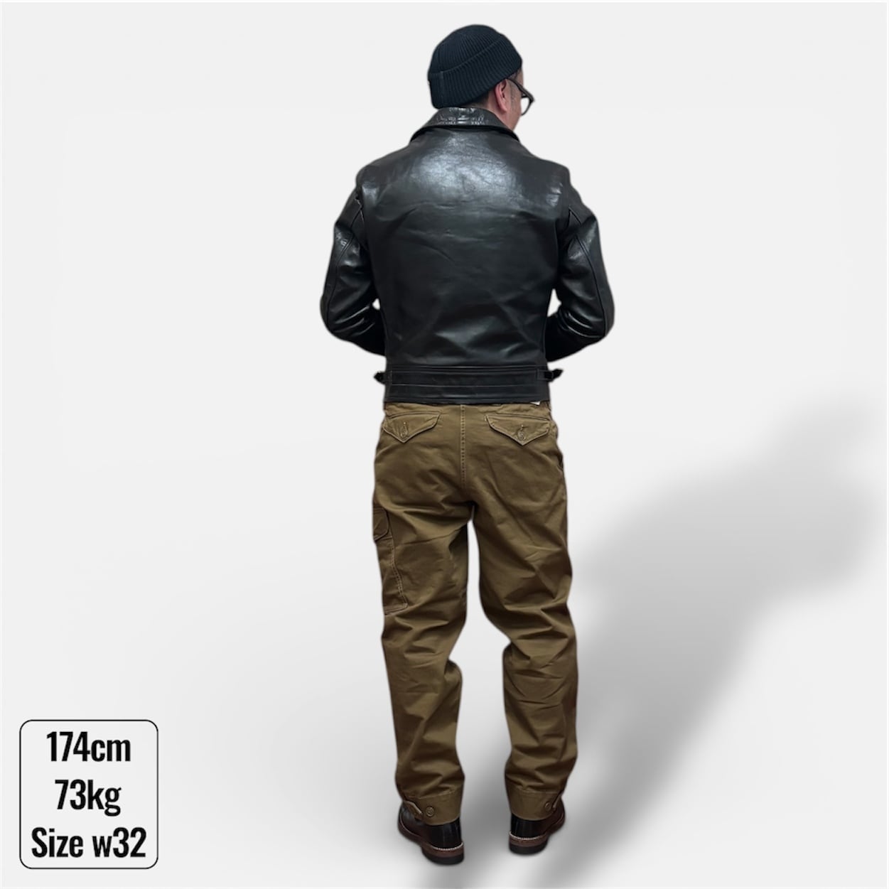 シルエットはヒップに少しゆとりがあり、裾にかけてテーパードの効いた全体的にスッキリした印象で、無骨でありながらキレイめにも着れて着回しの効く一枚です。