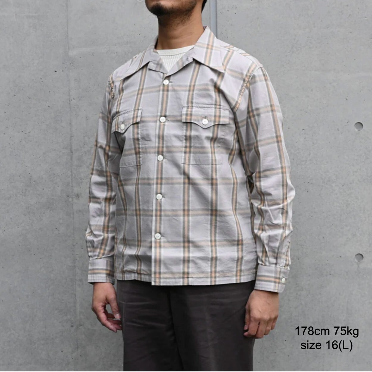 衿先の長いロングポイントカラーはワークシャツと異なる、フラップポケットは柄合わせ、背面のショルダータック、裾開きの切り替え、袖裏から脇まではパイピング処理、クラシカルなディティールを持ちながらもサンフランシスコのヒップカルチャーが香ります。