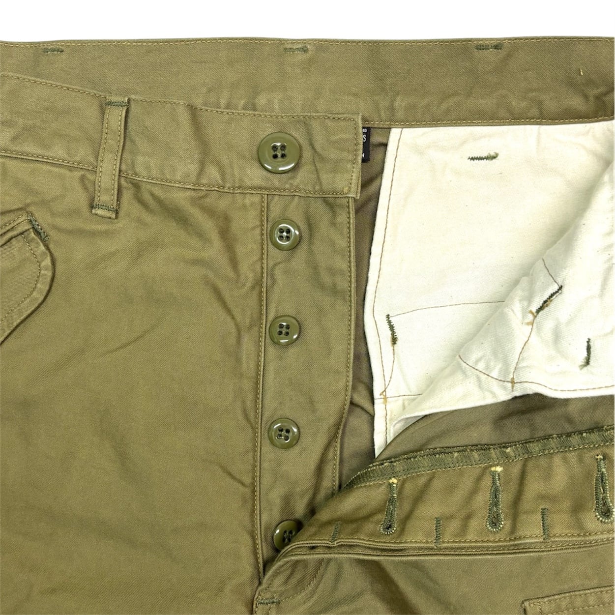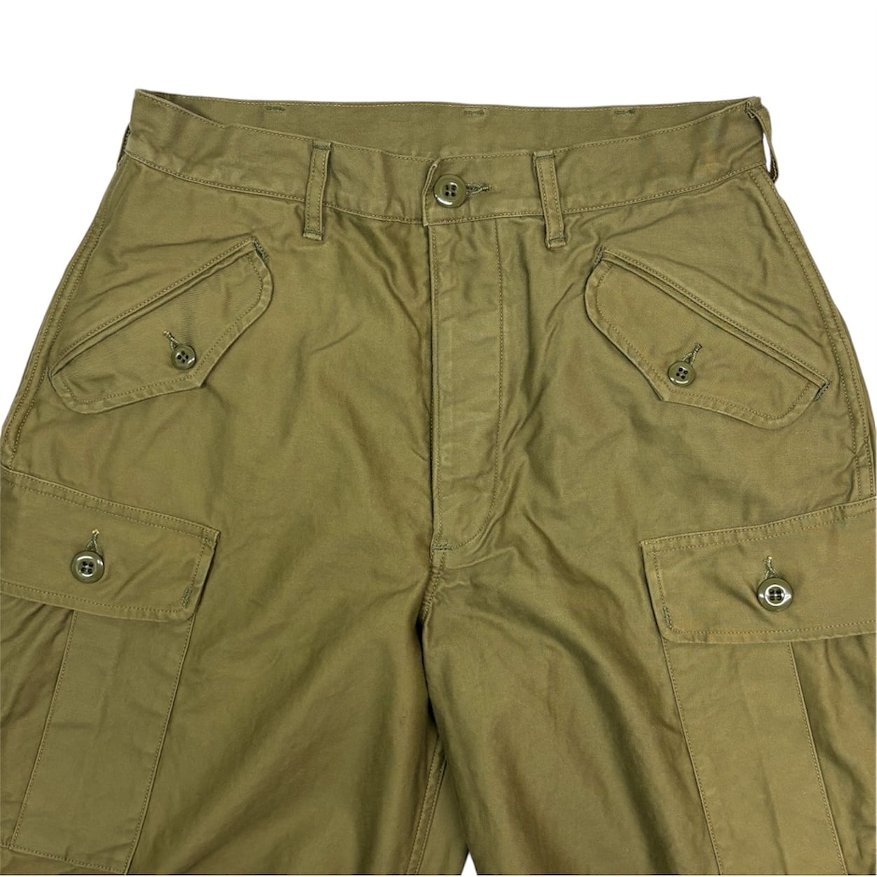 サイドのカーゴポケット、フロントとバックポケット。民間品としてボタンがフラップの外に出る仕様。生成りのコットンスレキ、膝のタック、バックポケット上のダーツ、尿素ボタン、比翼仕立てのボタンフライといったディティールが満載です。